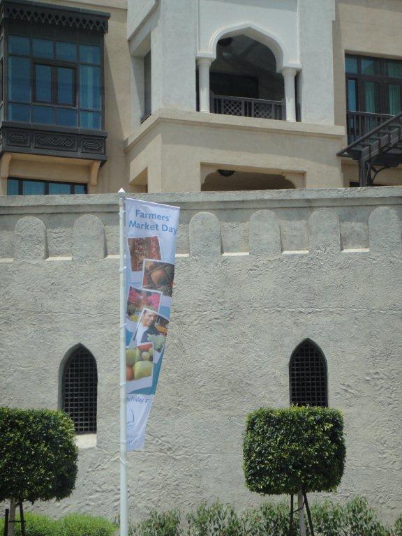 Souk al Bahar is a shopping centre that looks old but is actually very new. It takes many features from traditional Arabic architecture – windtowers, wooden screens, fortresses – to recreate an old-fashioned souk experience. It’s located in the heart of the new business area of Dubai, U.A.E., which has the tallest building in the world – the Burj Khalifa – at its centre. The contrasts couldn’t be more extreme. Baker & Spice, a restaurant which sources its ingredients locally, organised the farmer’s market, but as I drove up to the souk there were banners and flags galore announcing it with a strong EMAAR feel about it.