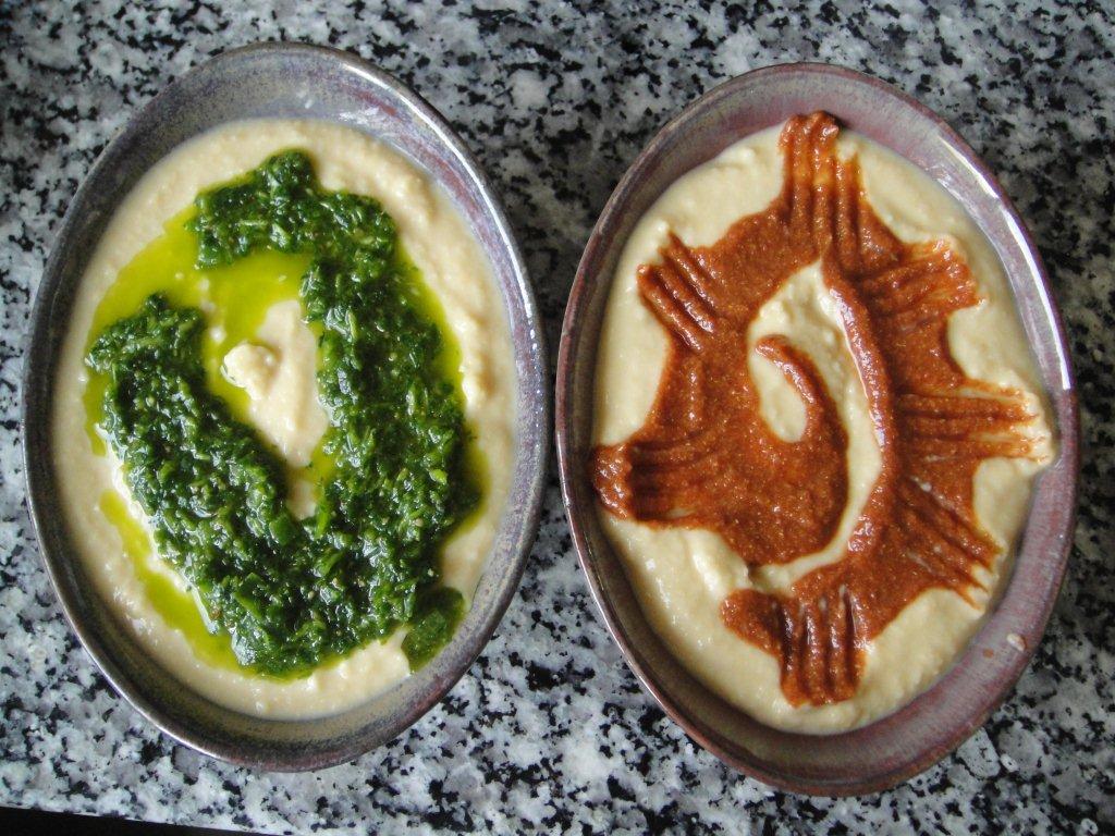 I’ve been back for a couple of weeks and was casting around for something to re-energize my hummus-jaded palette when I discovered something called zhoug – a Middle Eastern condiment from Yemen that I had never heard of or tried. Apparently it’s another dish that has been adopted by the Israelis with gusto and it’s often drizzled on hummus. I like the idea of adding the flavour on top rather than incorporating it; I’ve tried adding fresh coriander before and it turns a really unattractive shade of grey-green. I also thought I’d try to make something hot, earthy and spicy too – see what you think of my scarlet, harissa-inspired dressing (zhing?). I love the intensity of fresh green herbs used in abundance – like tabouleh – it makes me feel like I’m getting my entire vitamin intake for the week in a few forkfuls. Do you add any delicious ingredient to hummus? Is this legitimate variation on a theme or utter sacrilege? Recipes and tips on how to make the best hummus below.