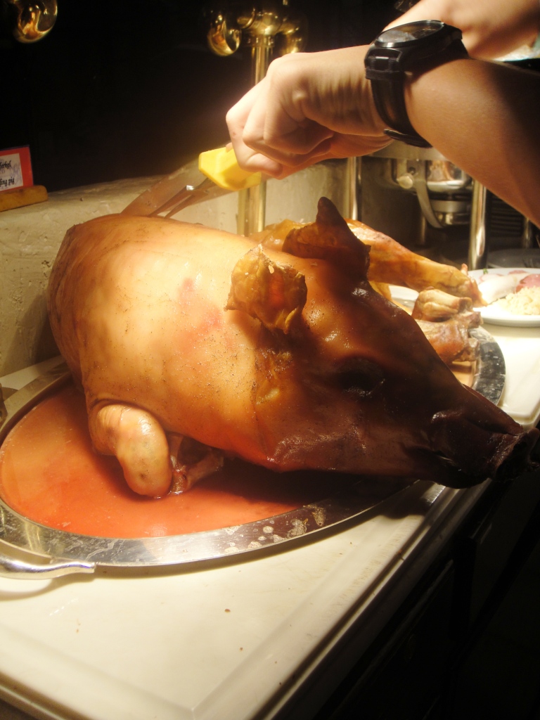 A diner tucks into the suckling pig