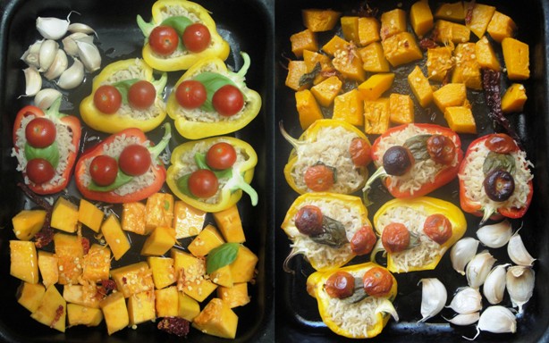 Preheat oven to 220ºC (425ºF). Place the pumpkin, garlic, olive oil and chilli on a baking tray and toss to combine. Cut the peppers in half, discard the seeds and membrane and stuff with the rice. Top with a couple of halved cherry tomatoes cut side down. Roast for 20 minutes or until golden and cooked through. Squeeze the garlic from the skins and place in a bowl with the pumpkin, basil, vinegar and extra olive oil. Mix well to combine. Serves 4.