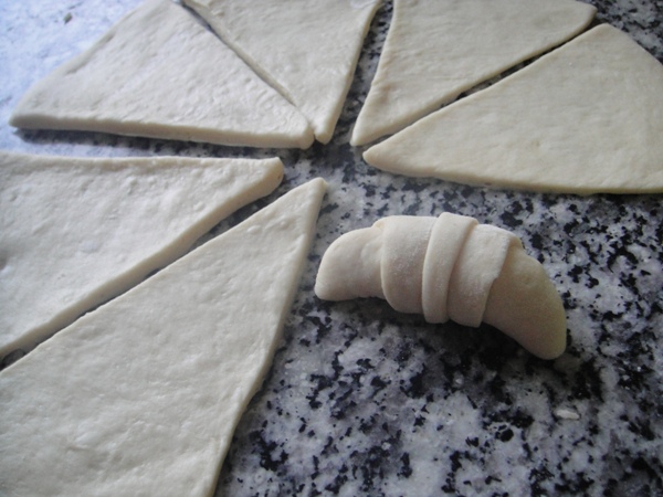 4. Re-knead the dough, divide into 5 equal parts, shape them into balls. Each part should make 8 rolls, so you’ll end up with 40 rolls, which should perfectly fit the regular oven pan, if lined in 5×8 order. Flatten each ball by hands over the floury working surface, then use a rolling pin to roll the dough out in a circle, a few millimeters thick. Use a sharp knife to cut the circle into 8 triangles. Take one triangle, stretch it in the air with your hands, to get it extended as much as you can, gently. Put some filling at the triangle base, then fold the edges of the base to avoid the filling leak out during baking. Roll. Arrange the rolls at the pan (5×8).
