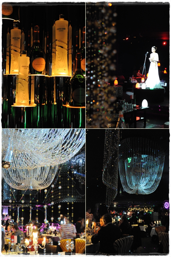 After being primed with a medicinal Red Carpet (a Campari and cranberry cocktail) and some elegant canapé at the bar (surrounded by groups of women in sparkly mini dresses) we moved to the dinner table which was slightly raised giving us a great view through the spangly curtains of crystal of the cavernous interior, (these cast very odd bruise-like shadows on flesh which is why there are no close-ups of people in these pictures!).