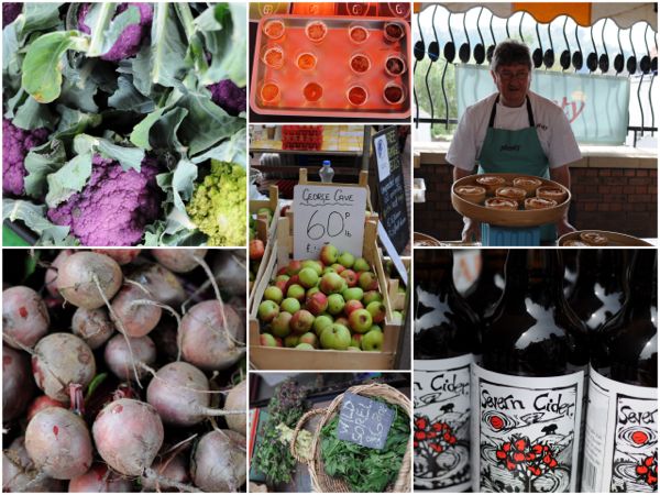 Purple cauliflower, Gloucester Ales, Plenty Pies, Severn Cider, Rupert Burdock’s foraging stall (and walk), local apples and beetroot