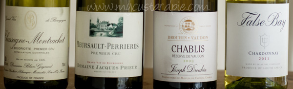 The two on the left are some of the most revered (and expensive) white wines in the world from Burgundy, the middle is from an area in France which has become synonymous with premium white wines which express the minerality of the Kimmeridgian clay on which they are grown and the last is a Chardonnay from a New World producer. You may or may not know that they are all made from the Chardonnay grape.