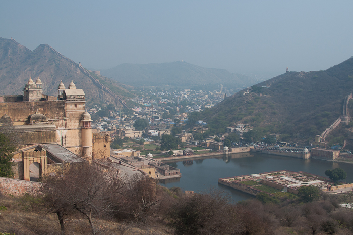 The fort is vast and signage not great but we resolutely eschew having a guide so just ramble about happening upon labyrinthine corridors, purdah screens, latrines (there were more than 100 throughout the fort all leading directly out into the fresh air), the famous mirror room – the Sheesh Mahal – and the king’s bedroom which has private entrances leading directly to it from the ladies’ apartments. The scale of the place is pretty mind-blowing and we try to imagine life there in late Medieval times; secure behind walls, freezing cold in Winter, a vast army of people required to maintain the life of the court. Not being part of a group means that we find ourselves alone a few times, a nice respite from the competitive clickers. ‘The garden in the lake is closed’ says a guard placed there for the sole purpose of communicating this information – it only opens at night during the light show and there are serried rows of benches set for this purpose. We climb higher along the wall which snakes through the surrounding hills. The concrete cladding, streaked black by polution-laden precipitation lends a weird sense of Cold War era Eastern block to the hills even though the Medieval forts lower above us on higher hills. We are shadowed by a man who is following us at distance to beg; we are relieved when he gives up after twenty minutes. Our entry fee to this astonishing place as foreigners is 200 rupees each – about 2 GBP (12 AED). The charge is 25 rupees for Indians.