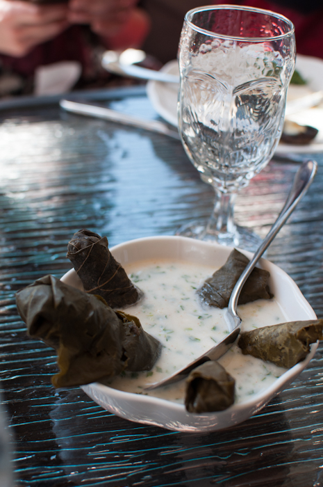 Stuffed vine leaves (tolma) in yoghurt sauce at Amabasadori