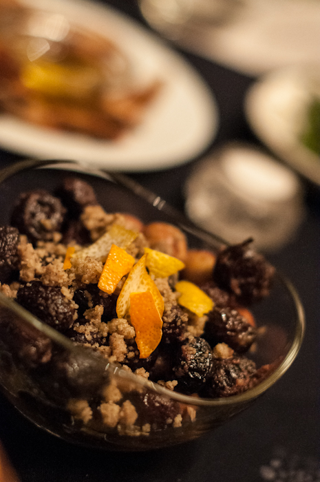Amazing warm Olives with citrus peel and shaved walnuts at Pheasant’s Tears