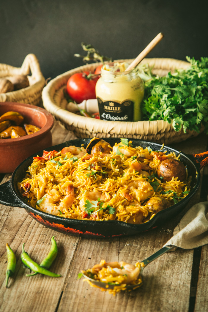 Honey, mustard prawns and spiced rice with loumi (dried limes)